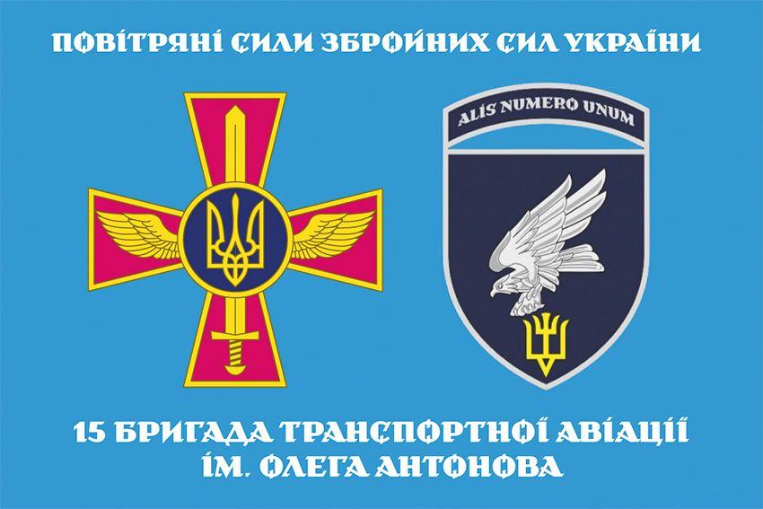Прапор 15-та бригада транспортної авіації імені Олега Антонова (15 БрТрА) ЗСУ з друком з прапорної тканини. Прапорна тканина – це синтетична міцна тканина. За рахунок спеціального дрібно-сітчастого переплетення тканини прапор стійкий до будь-яких погодних умов і витримує сильні вітрові навантаження. Тканина тонка, легка і добре розвивається на вітрі. За прапором просто доглядати – його можна прати і прасувати.