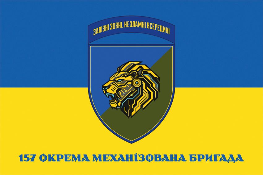 Купити прапор 157-ма окрема механізована бригада (157 ОМБр) СВ ЗСУ (лого 2) синьо-жовтий 1 ви можете в п’яти розмірах: