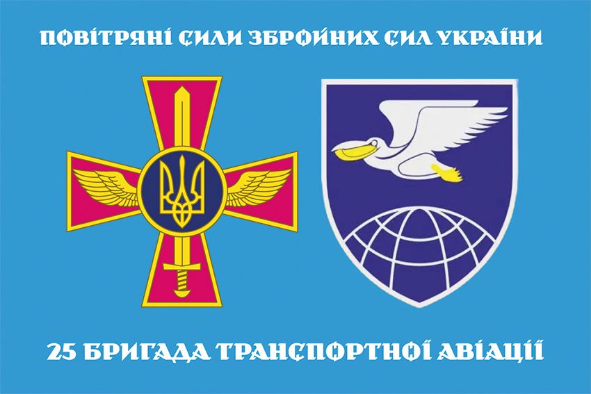 Прапор 25-та бригада транспортної авіації (25 БрТрА) ЗСУ з друком з прапорної тканини. Прапорна тканина – це синтетична міцна тканина. За рахунок спеціального дрібно-сітчастого переплетення тканини прапор стійкий до будь-яких погодних умов і витримує сильні вітрові навантаження. Тканина тонка, легка і добре розвивається на вітрі. За прапором просто доглядати – його можна прати і прасувати.
