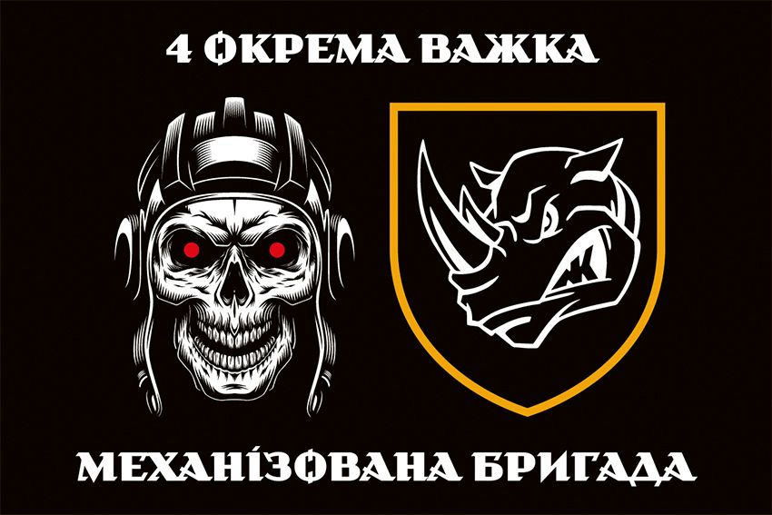 Прапор 4-та окрема важка механізована бригада (4 ОВМБр) СВ ЗСУ чорний з друком з прапорної тканини. Прапорна тканина – це синтетична міцна тканина. За рахунок спеціального дрібно-сітчастого переплетення тканини прапор стійкий до будь-яких погодних умов і витримує сильні вітрові навантаження. Тканина тонка, легка і добре розвивається на вітрі. За прапором просто доглядати – його можна прати і прасувати.
