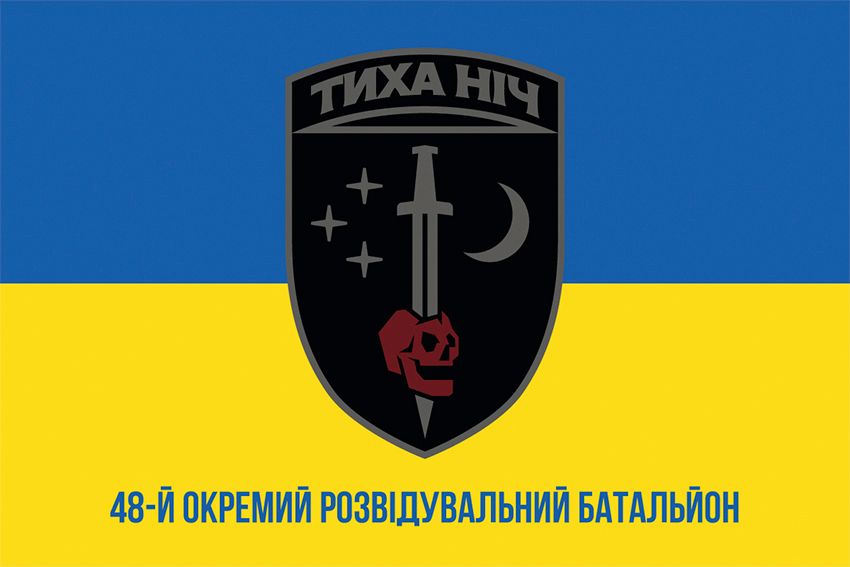 Прапор 48-й окремий розвідувальний батальйон «Тиха ніч» (48 ОРБ) СВ ЗСУ синьо-жовтий з друком з прапорної тканини. Прапорна тканина – це синтетична міцна тканина. За рахунок спеціального дрібно-сітчастого переплетення тканини прапор стійкий до будь-яких погодних умов і витримує сильні вітрові навантаження. Тканина тонка, легка і добре розвивається на вітрі. За прапором просто доглядати – його можна прати і прасувати.
