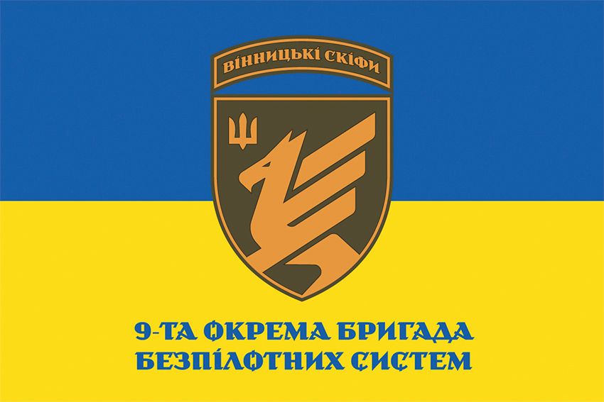 Прапор 9 окремої бригади безпілотних систем (9 ОБрБпС) «Вінницькі скіфи» ЗСУ синьо-жовтий 1 з друком з прапорної тканини. Прапорна тканина – це синтетична міцна тканина. За рахунок спеціального дрібно-сітчастого переплетення тканини прапор стійкий до будь-яких погодних умов і витримує сильні вітрові навантаження. Тканина тонка, легка і добре розвивається на вітрі. За прапором просто доглядати – його можна прати і прасувати.