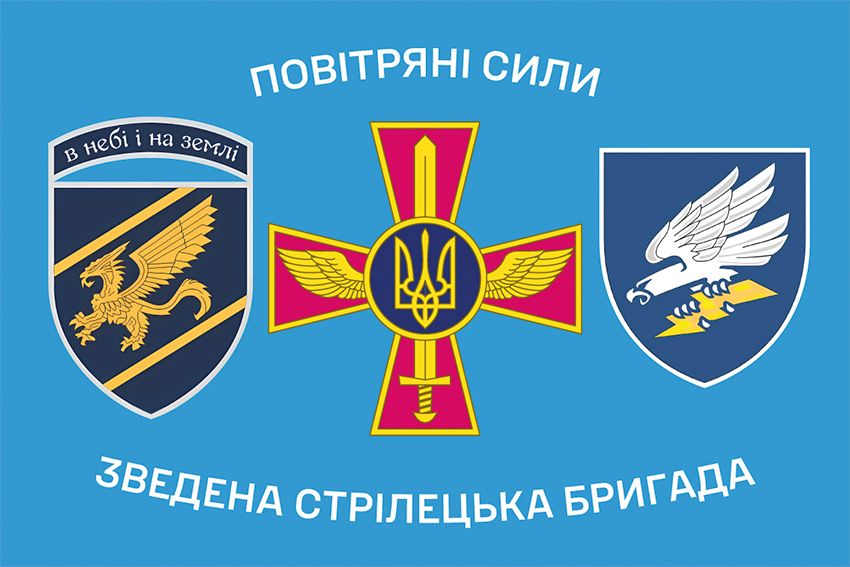 Прапор Зведена стрілецька бригада Повітряних Сил ЗСУ з друком з прапорної тканини. Прапорна тканина – це синтетична міцна тканина. За рахунок спеціального дрібно-сітчастого переплетення тканини прапор стійкий до будь-яких погодних умов і витримує сильні вітрові навантаження. Тканина тонка, легка і добре розвивається на вітрі. За прапором просто доглядати – його можна прати і прасувати.