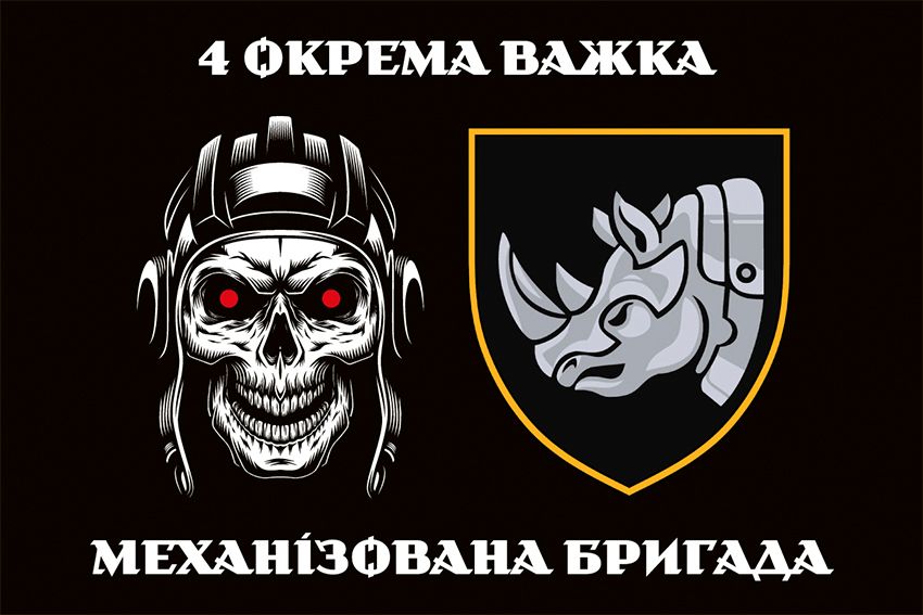 Купить флаг 4-я отдельная тяжёлая механизированная бригада (4 ОТМБр) СВ ВСУ (лого 4) черный вы можете в пяти размерах: