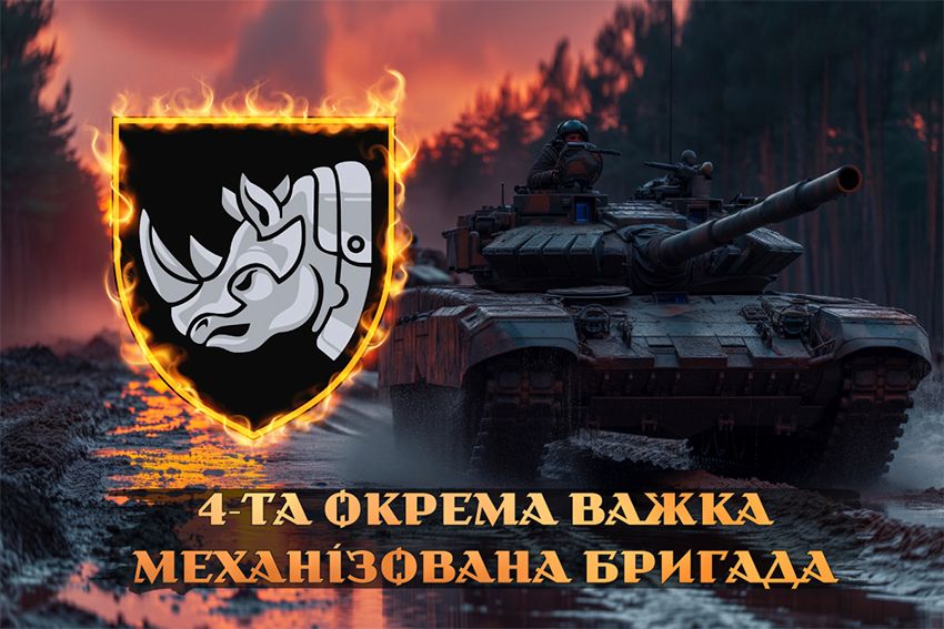 Купить флаг 4-я отдельная тяжёлая механизированная бригада (4 ОТМБр) СВ ВСУ (лого 4) танки на марше вы можете в пяти размерах: