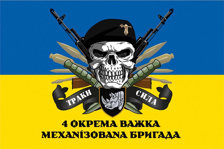 Купить флаг 4-я отдельная тяжёлая механизированная бригада (4 ОТМБр) СВ ВСУ (лого 4) «Траки сила» сине-желтый вы можете в пяти размерах: