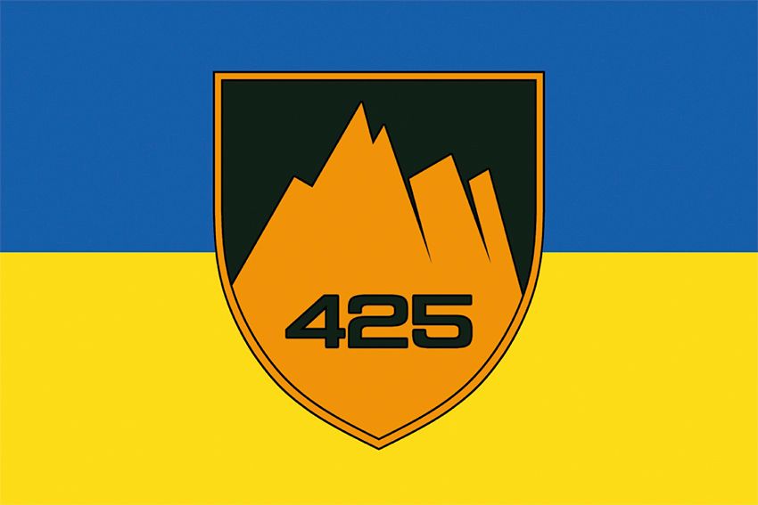 Купить флаг 425-й отдельный штурмовой полк «Скала» (425 ОШП) СВ ВСУ (лого 2) сине-желтый вы можете в пяти размерах: