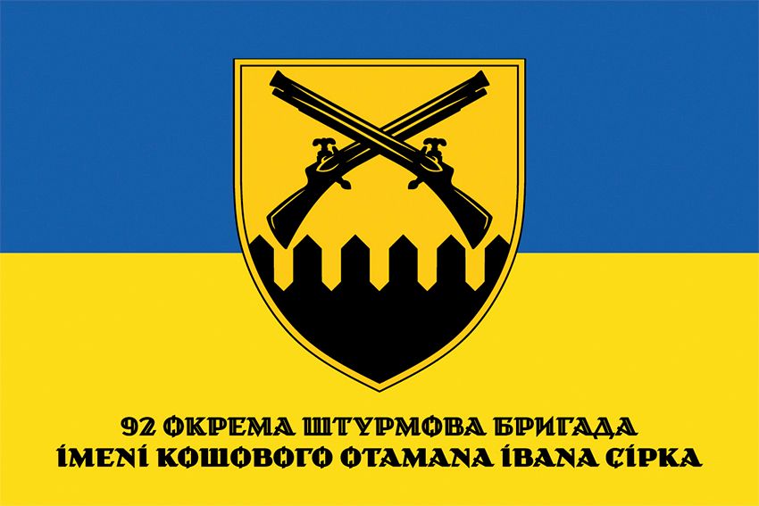 Купить флаг 92-я отдельная штурмовая бригада имени кошевого атамана Ивана Сирка (92 ОШБр) СВ ВСУ (лого 2) сине-желтый вы можете в пяти размерах: